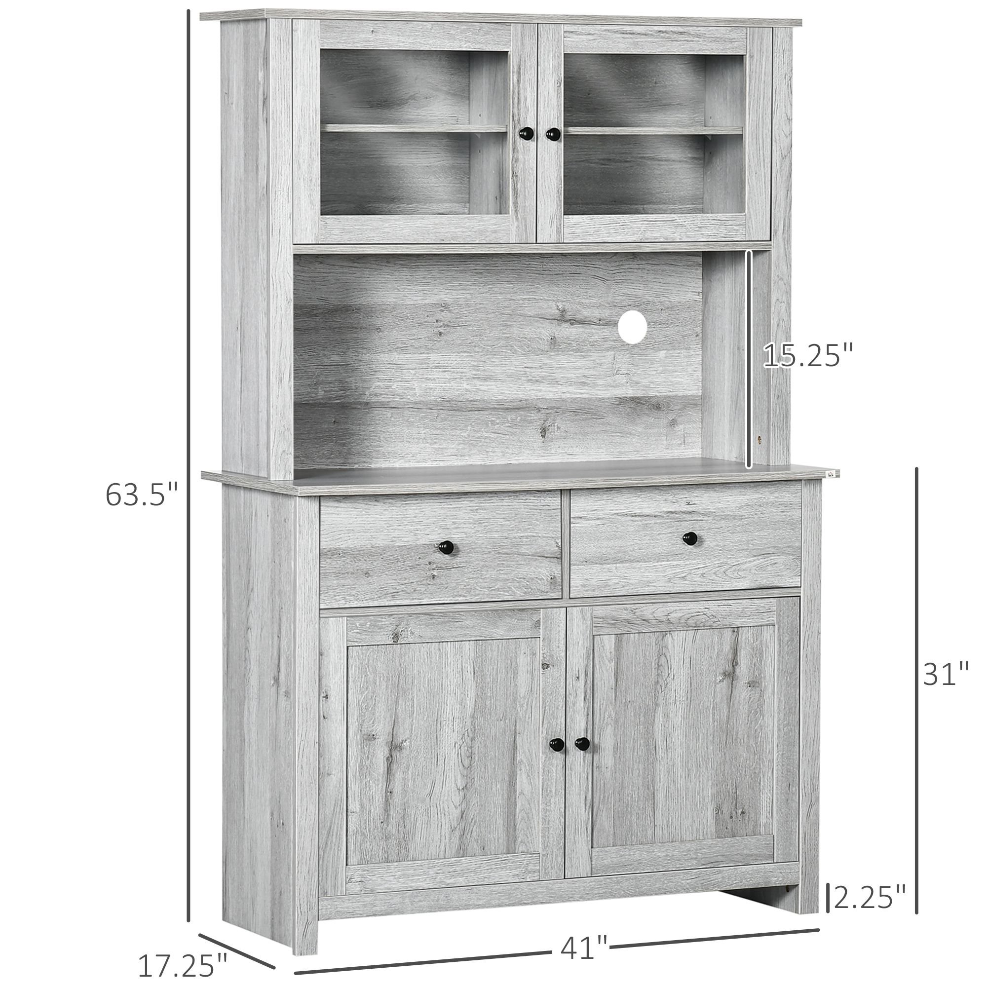 5.- Kitchen Cupboard Information: Overall Dimensions: 41" L x 17.25" W x 63.5" H. Weight Capacity: 110 lbs. (Overall), 15.5 lbs. (Each Shelf), 10 lbs. (Each Drawer), Assembly required..