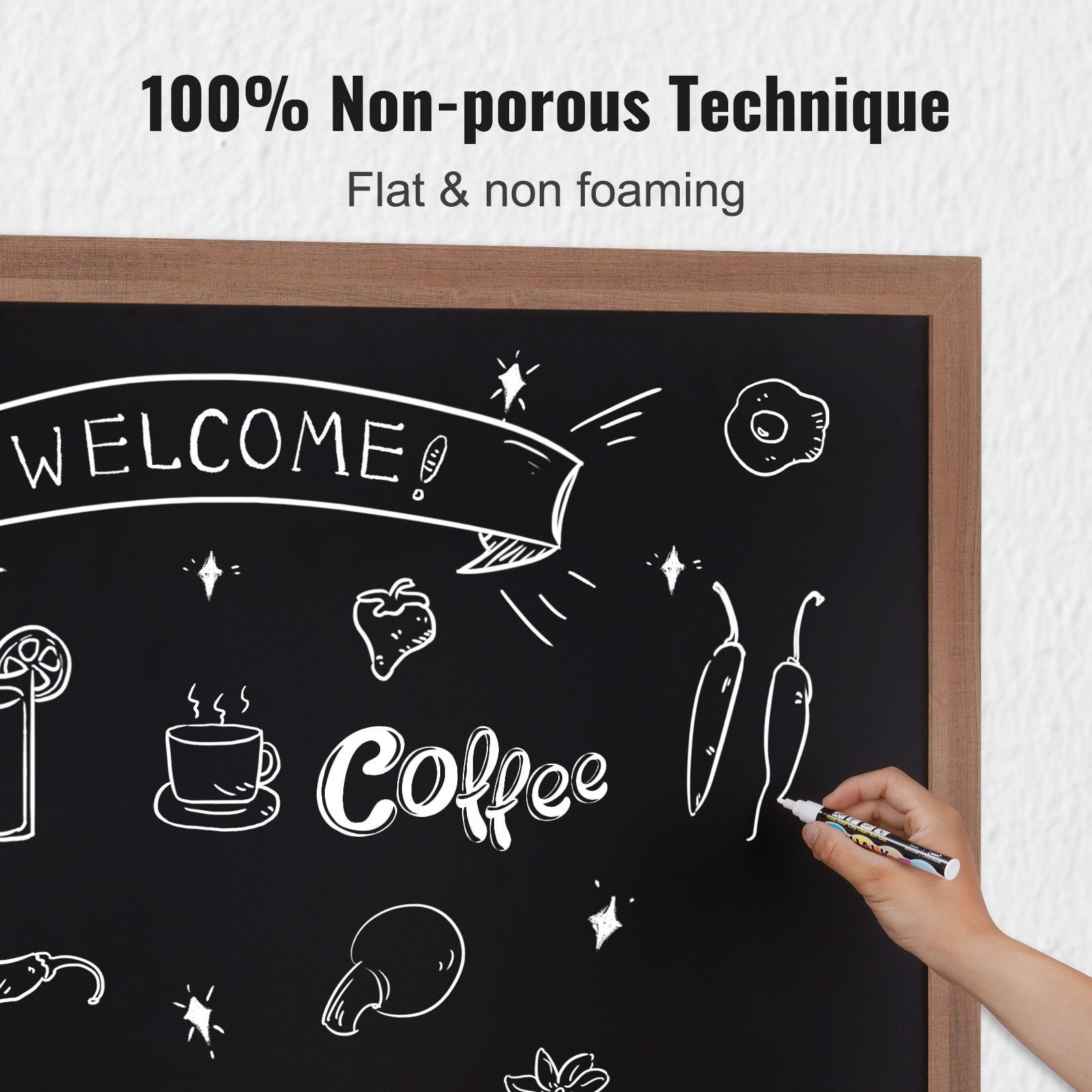 Highlights: 1.Premium Wall Mounted Blackboard: VEVOR 46" x 35" chalk boards provide plenty of space for organizing ideas, writing menus, posting pictures, and conveying romantic messages. In addition, the blackboard offers flexible installation options, allowing you to set it up horizontally or vertically to fit any space. Enjoy unparalleled creativity and productivity with this versatile tool. 2.Silky Writing & Wiping: Our surface uses an upgraded technology, 100% nonporous, offering an ultra-smooth writing experience. Wiping clean with a wet rag is effortless, leaving no visible scratches or ink marks. So you can rest assured to use it over and over again. And with its strong magnetic properties, you can easily attach your magnetic eraser and markers to the board, ensuring they're always within reach. 3.Durable & Sleek Material: This chalkboard frame surface adopts a high-quality steel plate with frosting treatment to enhance your writing experience and provides a perfect background for vibrant creativity. Crafted with a rustic wood frame, our blackboard is stunning and incredibly stable. Show off your writing skills! 4.Wide Application: You can use our easel chalkboard to write menus or advertise promotional messages outside your store, pub, or cafe. It is also perfect for wedding receptions, birthday parties, baby announcements, and family. 5.Comes with Everything You Need: Our blackboard includes everything you need to get started: 2 installation pendants, 4 liquid chalk markers, a magnetic eraser, and a rag for easy access to writing supplies. Compatible with liquid chalk markers as well as regular chalk. Please write down your thoughts and ideas, and share them with others immediately!